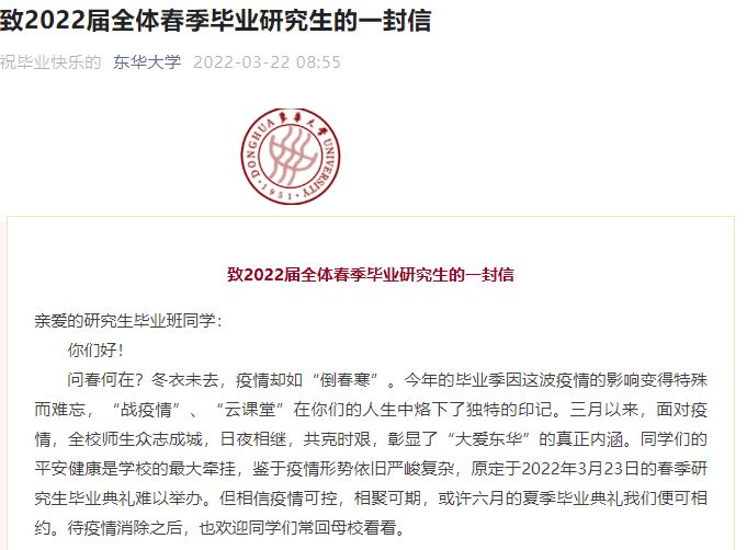 不過略有遺憾的是,最有儀式感的畢業(yè)典禮不得不延期。東華大學(xué)在《致2022屆全體春季畢業(yè)研究生的一封信》中表示,“同學(xué)們的平安健康是學(xué)校的最大牽掛,鑒于疫情形勢依舊嚴(yán)峻復(fù)雜,原定于2022年3月23日的春季研究生畢業(yè)典禮難以舉辦。但相信疫情可控,相聚可期,或許六月的夏季畢業(yè)典禮我們便可相約。待疫情消除之后,也歡迎同學(xué)們常回母校看看。”