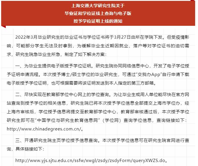 上海交通大學(xué)研究生院發(fā)布關(guān)于畢業(yè)證和學(xué)位證線上查詢與電子版授予學(xué)位證明上線的通知。通知表明,2022年3月畢業(yè)研究生的畢業(yè)證書與學(xué)位證書3月27日由所在學(xué)院下發(fā)。