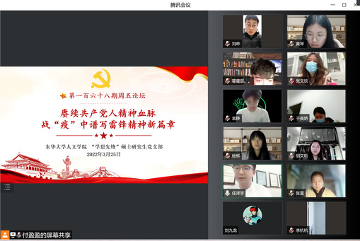 為貫徹落實習近平總書記關于學習雷鋒精神和弘揚偉大抗疫精神的重要講話精神,強化黨員青春奉獻、帶頭示范的責任擔當,匯聚勠力同心、共克時艱的團結偉力,3月25日,人文學院學思先鋒碩士研究生黨支部開展第168期周五論壇——賡續(xù)共產黨人精神血脈,戰(zhàn)“疫”中譜寫雷鋒精神新篇章。學院黨委書記韓哲宇、黨委副書記資雪琴、學生工作辦公室主任汪永安、黨建輔導員穆莉、黨支部全體黨員和入黨積極分子參加活動。