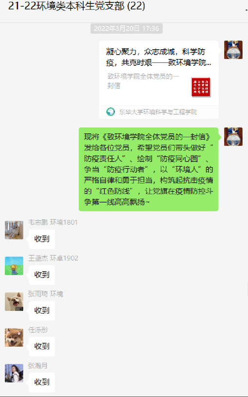 疫情爆發之初,環境類本科生黨支部積極響應學院黨委“凝心聚力,眾志成城,科學防疫,共克時艱”的號召,迅速組織召開支部委員會,對支部后期黨員政治理論學習、黨員培養發展以及作用發揮等一系列的工作進行部署安排。支部書記率先垂范,認真準備線上黨課內容,以“校園防疫,黨員先行——最可愛的守‘滬’人”為題,號召支部黨員以“環境人”的嚴格自律和勇于擔當,構筑起抗擊疫情的“紅色防線”,讓黨旗在疫情防控斗爭第一線高高飄揚。
