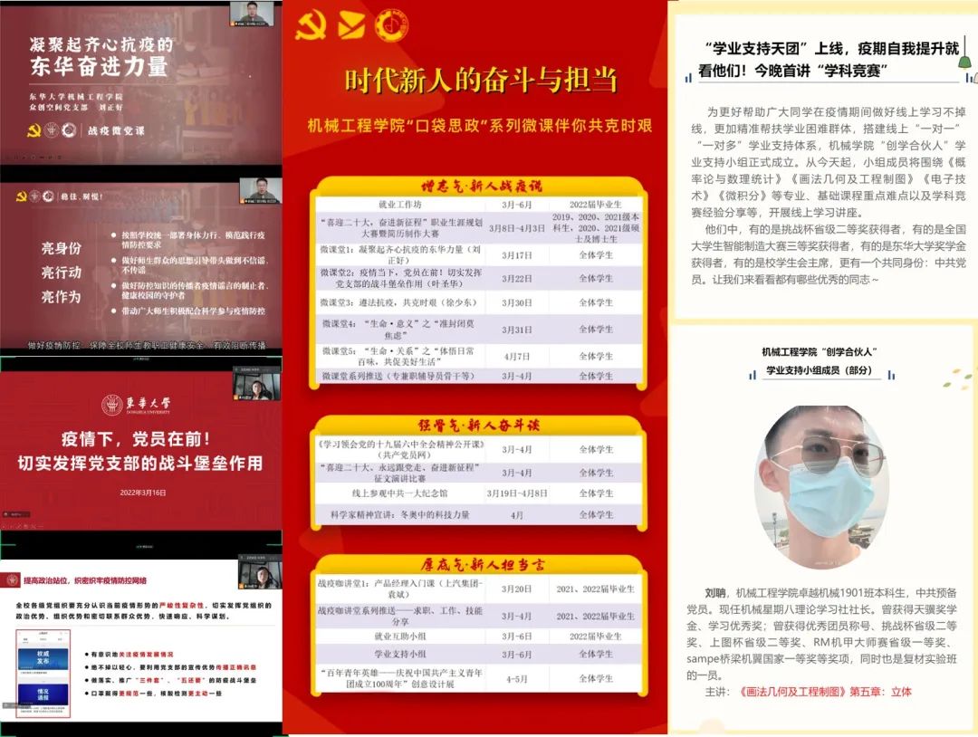 堅持就是勝利。機械學院黨委認真貫徹落實習近平總書記關于做好疫情防控工作的重要指示精神,出臺常態化防控措施和應急預案,成立物資后勤、教學質量保障等8個專項工作小組。在疫情防控的關鍵時刻,學院黨委充分發揮黨支部的組織力、戰斗力和凝聚力,號召黨員帶頭做好一線防疫的“扛旗人”。從教工到學生,從黨員到群眾,每個人都以自己的無私奉獻,守在戰“疫”前線。