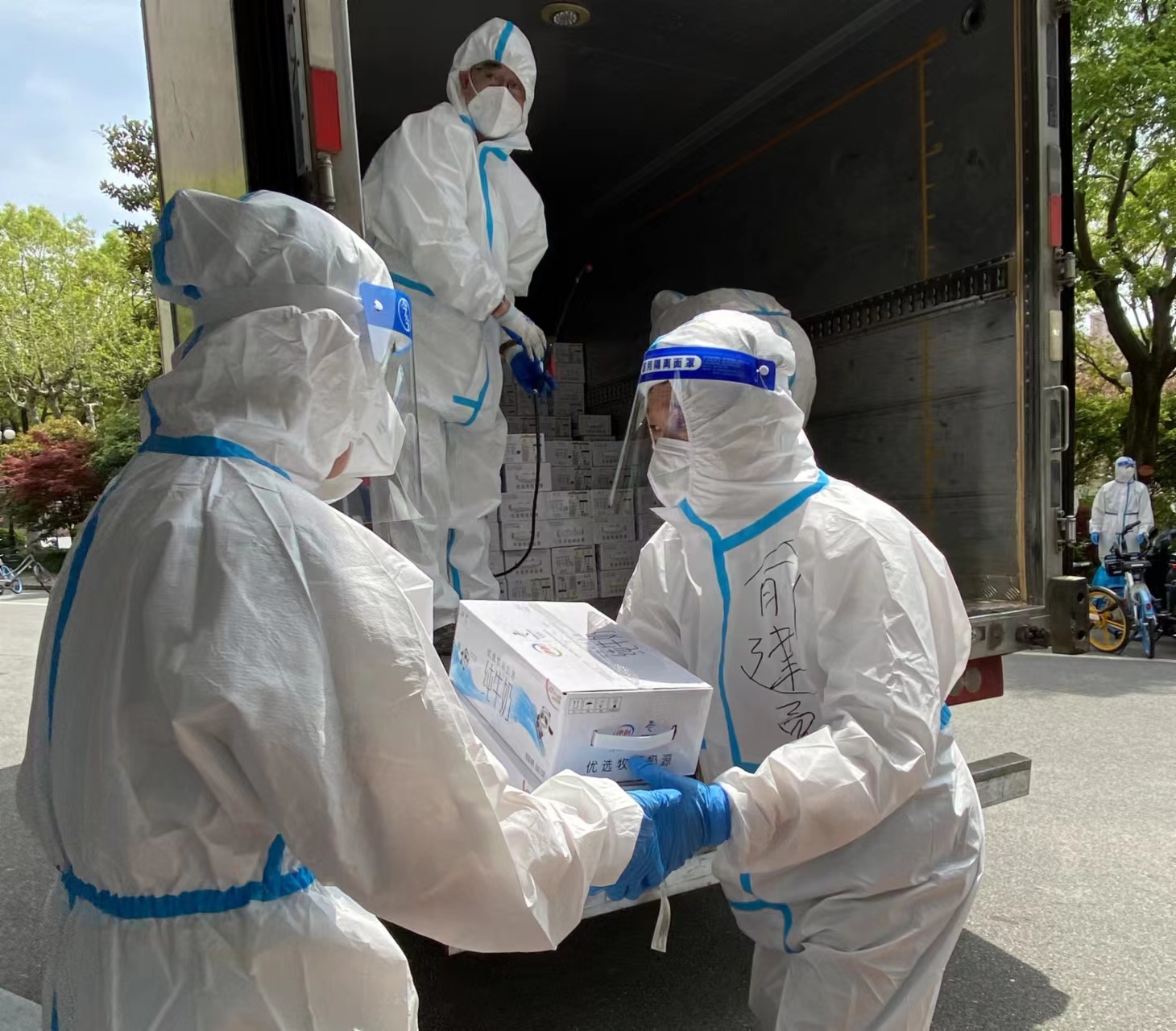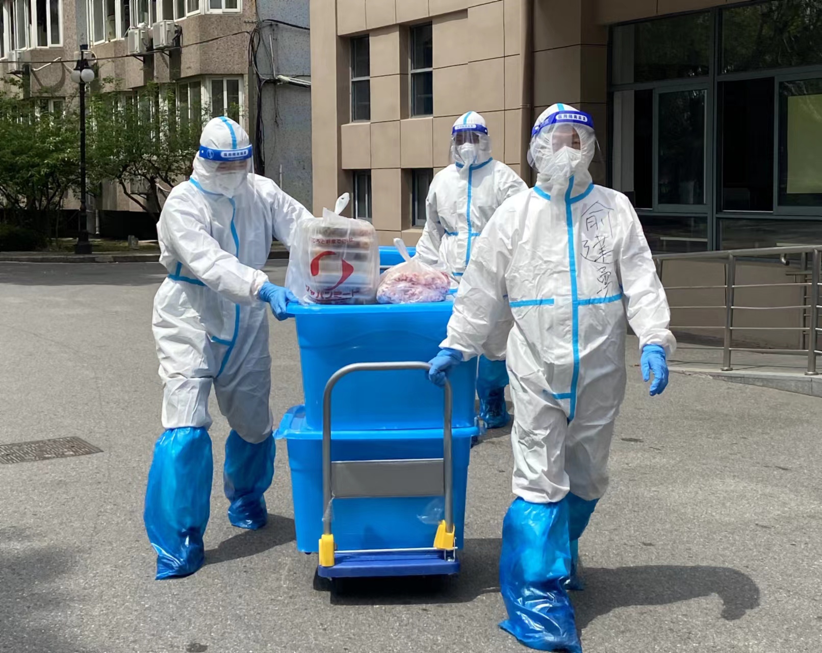 拉著滿載盒飯的小推車往返于食堂和學生宿舍,再一起把餐盒搬運至宿舍樓前……4月10日中午烈日下,校長俞建勇帶領延安路校區教職工志愿送餐隊為學生送餐,并再次向堅守在學校疫情防控一線的相關工作人員表示慰問。