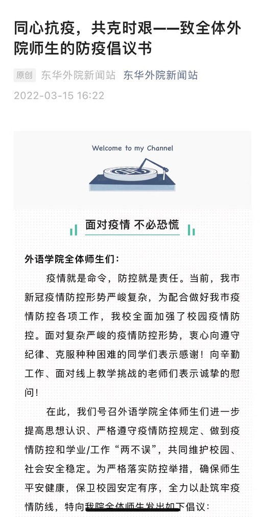 “我院向全體師生發(fā)出如下倡議……做聯(lián)防聯(lián)控的踐行者,做防疫措施的示范者,做校園防疫的守護者,做抗疫精神的傳播者……”3月15日,學院黨委通過學院微信公眾號發(fā)布《同心抗疫,共克時艱——致全體外院師生的防疫倡議書》,號召廣大黨員主動亮身份、亮行動、亮作為,在抗擊疫情和保障教學兩個陣地上積極作為,身體力行、模范踐行疫情防控要求。本輪疫情發(fā)生以來,學院黨政領導帶頭進校值守,靠前指揮,堅守崗位;各支部耐心細致做好師生思想政治工作,帶領師生黨員亮身份、見行動;學院黨員教師全員到社區(qū)報到,在學校和社區(qū)核酸檢測、物資發(fā)放等抗疫一線工作中爭當志愿者,踐行黨員初心使命。