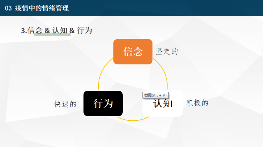 在講座中,段鑫星聚焦疫情下生活方式的變化,概括總結了安全感、控制感、信任感、自尊、關系等五種人的需要所面臨的現實挑戰。從現實生活中“想法中最多的是什么”“情緒反應有什么不同”等七個問題出發,概括提出接納、積極認知、覺察情緒、目標簽訂等十個心理建設方法。她還提出要從情緒自我照顧、情緒自我服務兩個維度,以及“倦怠”“焦慮”“憤怒”“輕信”等10種常見心理狀態出發,做好情緒管理和自我心理建設。