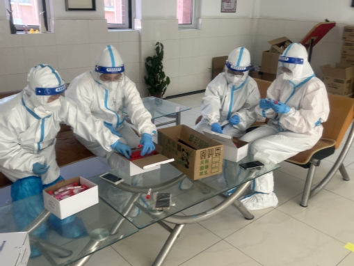 (“‘疫’路守護”第八宿舍臨時黨支部書記、專職輔導員高加加老師、駐樓志愿教師李彬老師做核酸檢測準備)