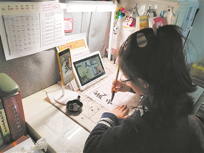 上海市普陀區武寧路小學學生在上線上書法課。資料圖片