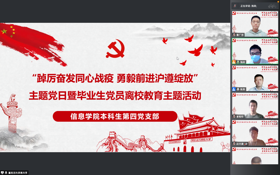 為深入學(xué)習(xí)貫徹習(xí)近平總書記在慶祝中國共產(chǎn)主義青年團成立100周年大會上的重要講話精神,做好疫情防控背景下畢業(yè)生黨員離校教育工作,5月27日,信息學(xué)院本科生第四黨支部開展“踔厲奮發(fā)同心戰(zhàn)疫 勇毅前進滬遵綻放”畢業(yè)生黨員離校教育主題黨日活動。副校長陳革出席活動,黨支部全體黨員參與活動,活動由黨支部書記施政主持。