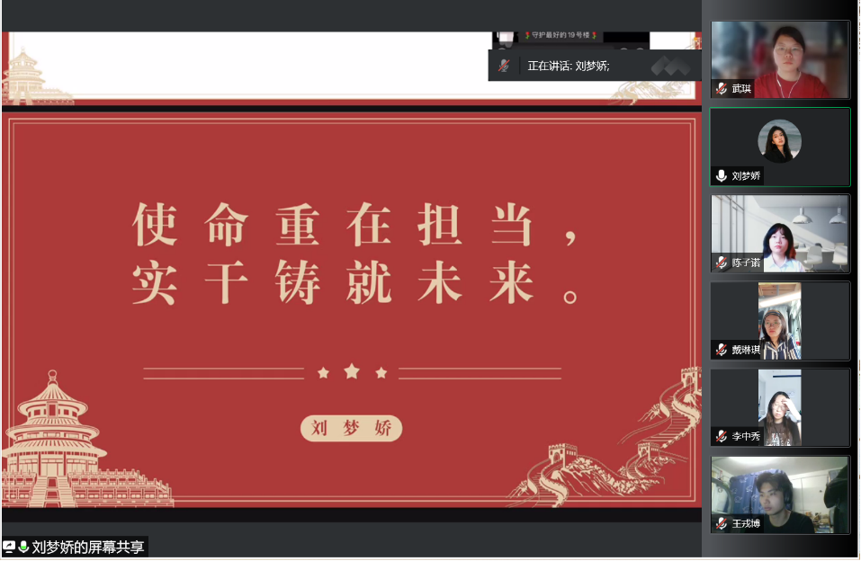 為深入學(xué)習(xí)貫徹習(xí)近平總書記在慶祝中國(guó)共產(chǎn)主義青年團(tuán)成立100周年大會(huì)上的重要講話精神,近日,紡織學(xué)院青春領(lǐng)航畢業(yè)班學(xué)生黨支部通過線上會(huì)議的形式開展“青春心向黨百年再啟航”主題黨日活動(dòng)。副校長(zhǎng)舒慧生出席活動(dòng),學(xué)院黨委書記李成龍、院長(zhǎng)顧伯洪以及黨支部全體黨員參加活動(dòng)。活動(dòng)由黨支部書記陳欣園主持。