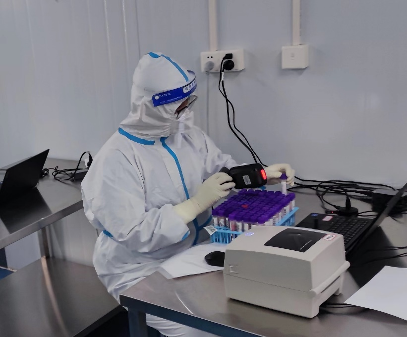 走進(jìn)東華大學(xué)PCR方艙實(shí)驗(yàn)室,就可以見證一份準(zhǔn)確的核酸報(bào)告是如何通過“三步走”誕生的。先編號,打印標(biāo)簽;再掃描,錄入系統(tǒng)——第一步,在樣品接收房里,檢驗(yàn)人員正為剛剛送到的樣本進(jìn)行逐一編號和信息錄入。
