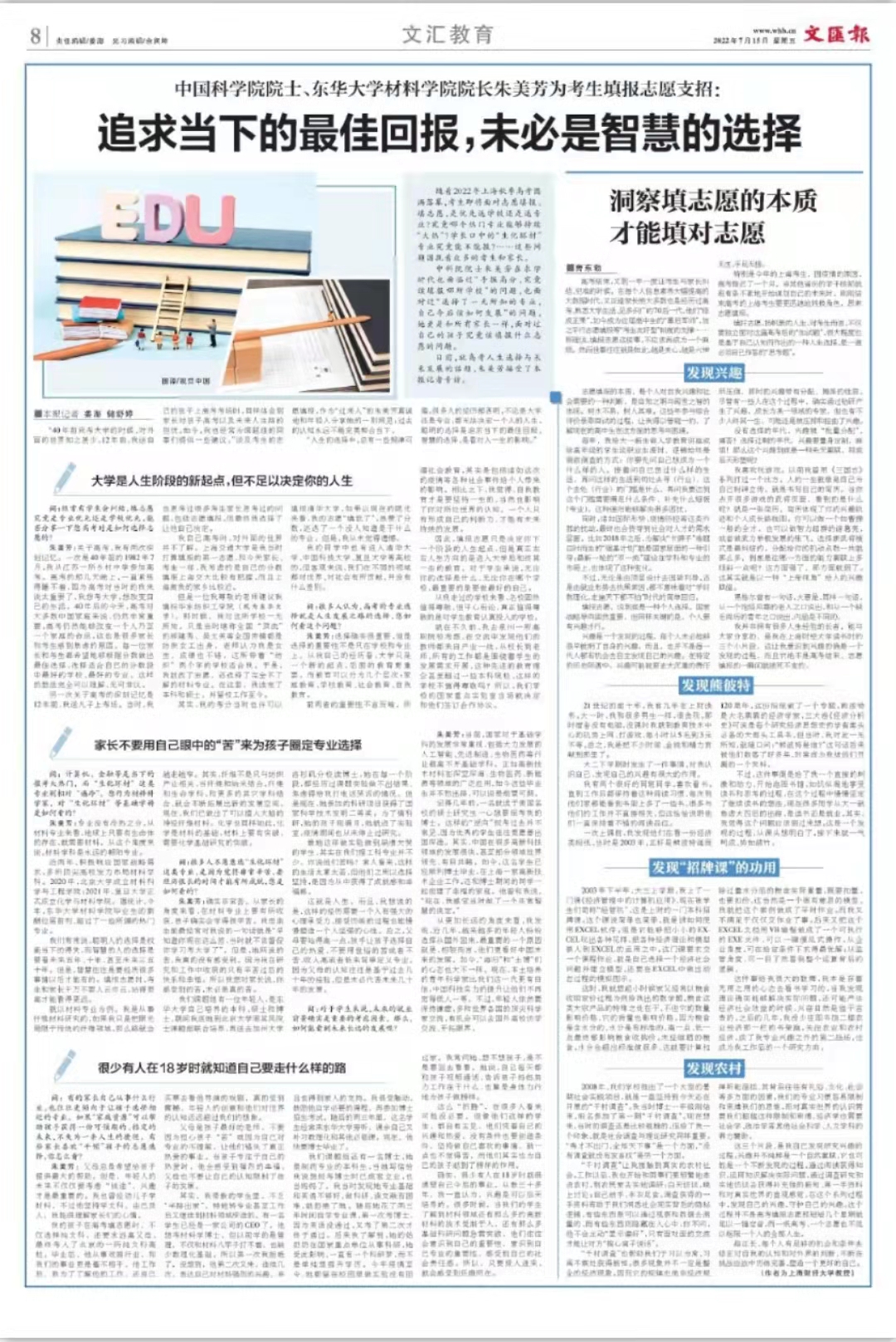文匯報整版:中國科學院院士、東華大學材料學院院長朱美芳為考生填報志愿支招 追求當下的最佳回報,未必是智慧的選擇