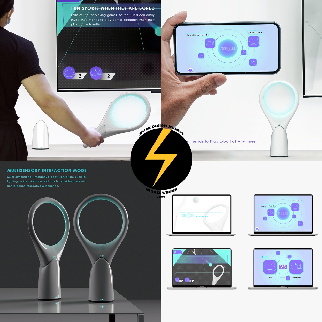 該設(shè)計(jì)靈感源于新冠肺炎疫情下人們的現(xiàn)實(shí)困境。由于保持社交距離是遏制新冠病毒傳播的有效手段之一,但對(duì)居家中的人們來說會(huì)產(chǎn)生孤寂、焦慮等負(fù)面情緒。這是一款運(yùn)動(dòng)游戲手柄,用于在自我健康管理期間緩解用戶的消極情緒。它利用體感和無線網(wǎng)絡(luò)技術(shù)實(shí)現(xiàn)室內(nèi)運(yùn)動(dòng)和隔離區(qū)的互聯(lián)。它不僅是一個(gè)用來滿足人們的室內(nèi)運(yùn)動(dòng)和社會(huì)交往需求的物聯(lián)網(wǎng)球拍,也是一款溫暖的陪伴小夜燈。