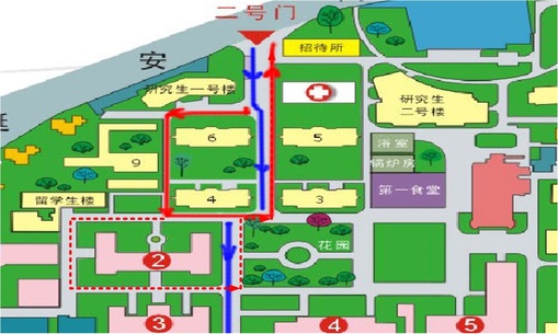 (紅線和紅虛線為送新生未審批車輛入校線路;藍線為校內職工和已審批車輛入校線路)