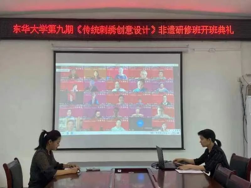 9月12日,東華大學第九期“傳統(tǒng)刺繡創(chuàng)意設計”研修班開班典禮在線上舉行。文化和旅游部原副部長項兆倫,東華大學副校長陳南梁,上海市文旅局非遺處處長陳平,貴州省遵義市桐梓縣婦聯(lián)主席梁秀容,東華大學服裝與藝術(shù)設計學院和相關(guān)部處負責人,研修班任課教師、全體學員及結(jié)對設計學生等60多人參加儀式。非遺教研中心主任柯玲主持典禮。