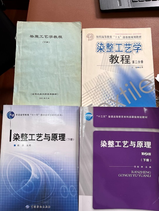 “編寫教材與寫論文不同,多一字少一字都不行,每一句話、每一處安排都應經得起推敲和驗證。”趙濤是圖書館的常客,那個年代,查閱文獻不像現在這樣方便,為了掌握國內外最新理論和技術,圖書館有關化學與染整工程類的書籍、期刊基本上都被他翻閱過,有用的資料都被他復印過,趙老師辦公室立柜下方曾塞滿厚厚的文獻和筆記,見證著他對教材編寫的濃厚興趣和全身心的積累與思考。秉持著“教材中每一句話都應該是經典”的堅守與執著,十年來,他組織召開多次教材工作會議和訪談,對紡織類院校師生的使用情況包括教學效果、教學適應性、先進性、系統性以及編校質量等進行不間斷跟蹤及調研,力爭合理編排篇章結構,反映國內外最新染色印花理論和工藝技術,并突出清潔生產和綠色紡織品的概念。趙濤主編的《染整工藝學教程》在2005年入選紡織高等教育“十五”部委級規劃教材。2009年《染整工藝與原理(第一版)下冊》出版發行,歷經2版,重印4次。最新的資料數據分析,大量的實驗比對,悉心的教學研究,數十年磨一劍,最終,《染整工藝與原理(第二版)下冊》榮獲首屆全國教材二等獎。他說:“每個人沉下心來,為學校做好一件事就夠了。”