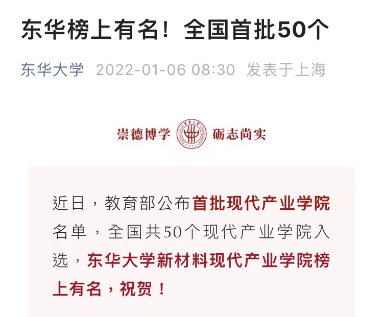 2021年,繼獲批為上海市首批現代產業學院后,再獲批國家首批現代產業學院。新材料現代產業學院實施1+3+5+X管理形式,引進中國商飛上海飛機制造有限公司等5家主要合作企業參與,突出服務國家重大戰略、突出實踐育人,突出科教融合、突出立德樹人,注重創新賦能、工程導向、教研相長。