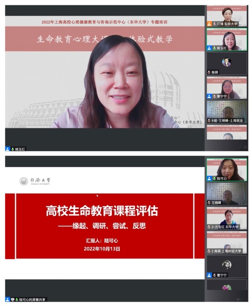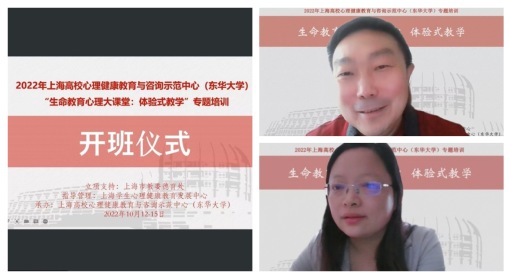 10月12日-15日,由上海高校心理健康教育與咨詢示范中心(東華大學)承辦的2022年度“生命教育心理大課堂:體驗式教學”專題培訓在線上順利舉行。10月12日,我校心理健康教育與咨詢中心主任曹寧寧主持開班式,來自上海交通大學、華東師范大學、華東理工大學、上海師范大學等40所高校的72名心理教師和心理輔導員齊聚云端,開啟4天的系統學習。培訓圍繞心理健康和生命教育互動體驗課堂的教學理念、設計思路、示范講解等內容展開,學員分組進行實操性學習、實踐與演練。