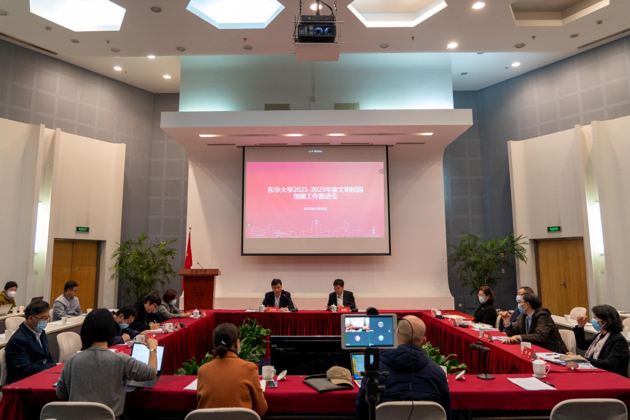 俞建勇在主持中指出,文明校園創建是全面貫徹落實習近平新時代中國特色社會主義思想的有力舉措,是學習貫徹落實黨的二十大精神的生動實踐,是貫徹黨的教育方針、堅持社會主義辦學方向、落實立德樹人根本任務的重要載體。對接下來的工作,俞建勇提出,一要加強組織領導,各單位要以本次推進會為契機,準確把握全面建設社會主義現代化國家賦予高校的使命任務,聚焦教育強國建設、立德樹人根本任務以及學校“十四五”奮斗目標,著眼培養擔當民族復興大任的時代新人,緊扣“六個好”創建標準,進一步提升文明校園創建工作水平和質量。二要不斷完善長效機制,準確把握學校文明文化工作高質量發展的內涵,大力營造師生全員參與的文化工作領導體制和工作機制。各單位要結合自身特點,深入挖掘學校優秀文化傳統,承擔好建設校園文化的任務。三要努力營造奮進文化氛圍,準確把握新發展格局,對標對表一流,強化戰略思維、辯證思維、系統思維、創新思維、底線思維等科學思維,加強系統謀劃、自主改革、共同協作,著力解決跨部門辦事難、跨學院合作難、跨學科交叉難問題,以一流的工作成效不斷增強全體東華人的價值認同、使命認同和情感認同,充分提升和彰顯學校文化軟實力。