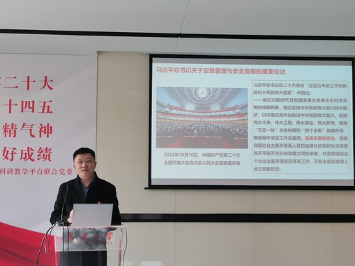 陳革以“防風險 除隱患 保平安”為題,帶領大家共同學習了黨的二十大報告中關于應急管理和安全發展的重要論述。他強調,黨中央、國務院一貫高度重視校園安全工作,習近平總書記等中央領導同志先后作出一系列重要指示批示,高校實驗室安全是高校校園安全的重要組成部分,大家要堅持“安全第一、預防為主”,全面貫徹落實黨的二十大精神,立足本職工作,持續做好實驗室安全管理工作。結合學校實驗室安全管理工作現狀,他從安全責任體系、安全準入機制、安全教育培訓、隱患排查治理、安全獎懲機制、應急能力建設等方面,介紹了具體落實舉措和下一步推進路徑,希望大家以實際行動為學校事業高質量發展筑牢安全“防火墻”。