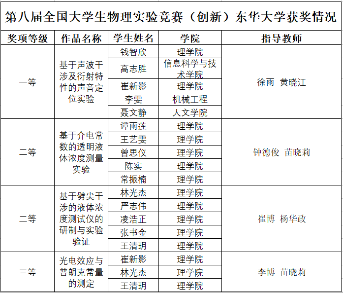 【附】:第八屆“全國大學生物理實驗競賽(創新)”東華大學獲獎情況