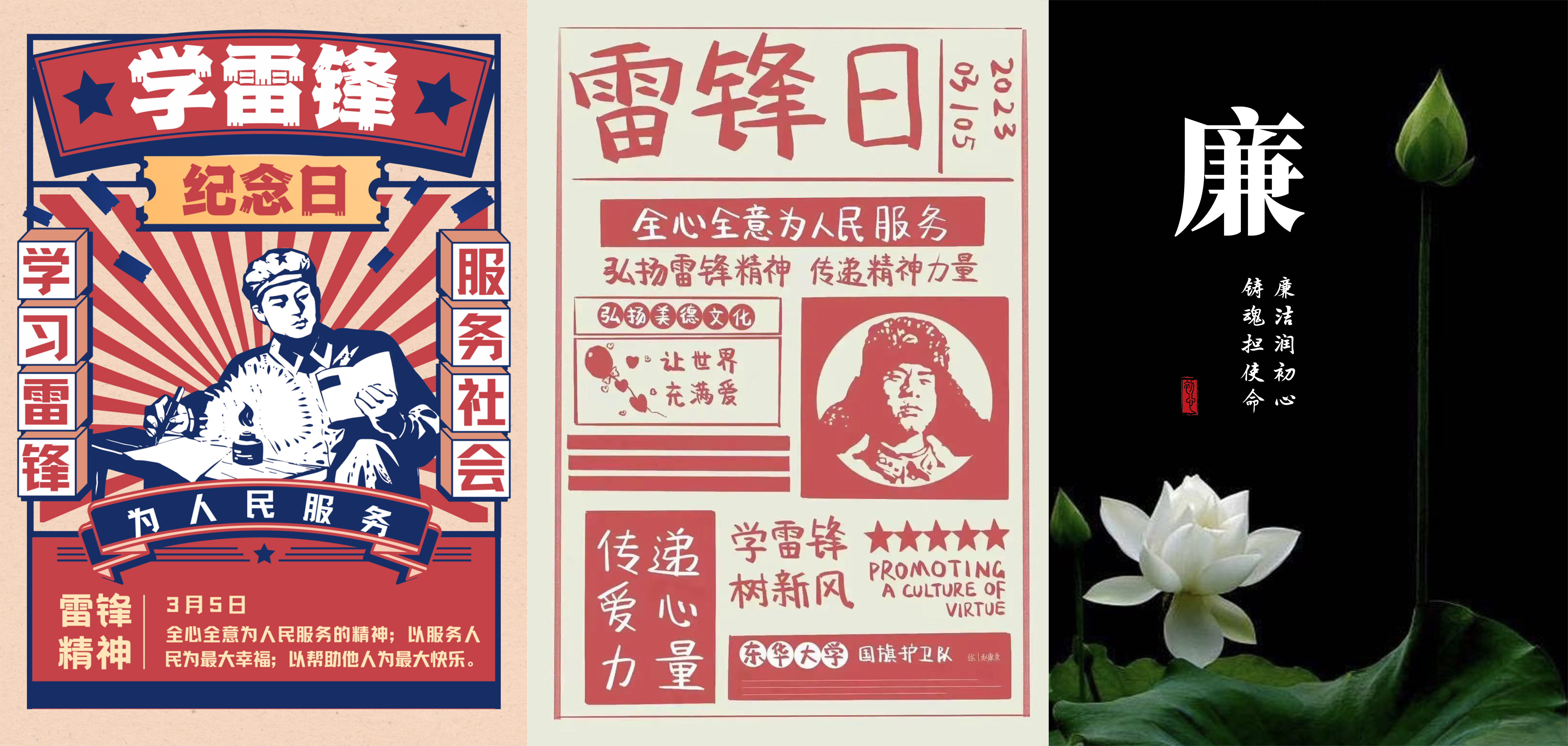 為深入學習黨的二十屆二中全會精神,貫徹落實黨中央《關于加強新時代廉潔文化建設的意見》,深入開展學習貫徹習近平新時代中國特色社會主義思想主題教育,學生黨支部結合專業特色,開展以“學雷鋒精神,展青春風采”、“廉潔潤初心·鑄魂擔使命”等為主題的手繪作品征集活動。國旗護衛隊黨支部以雷鋒形象和志愿服務為元素,提筆“畫”說踐行;研究生學生黨支部挖掘提煉廉潔校園文化的思想內涵,“清心妙語”創作公益海報,營造良好育人環境。