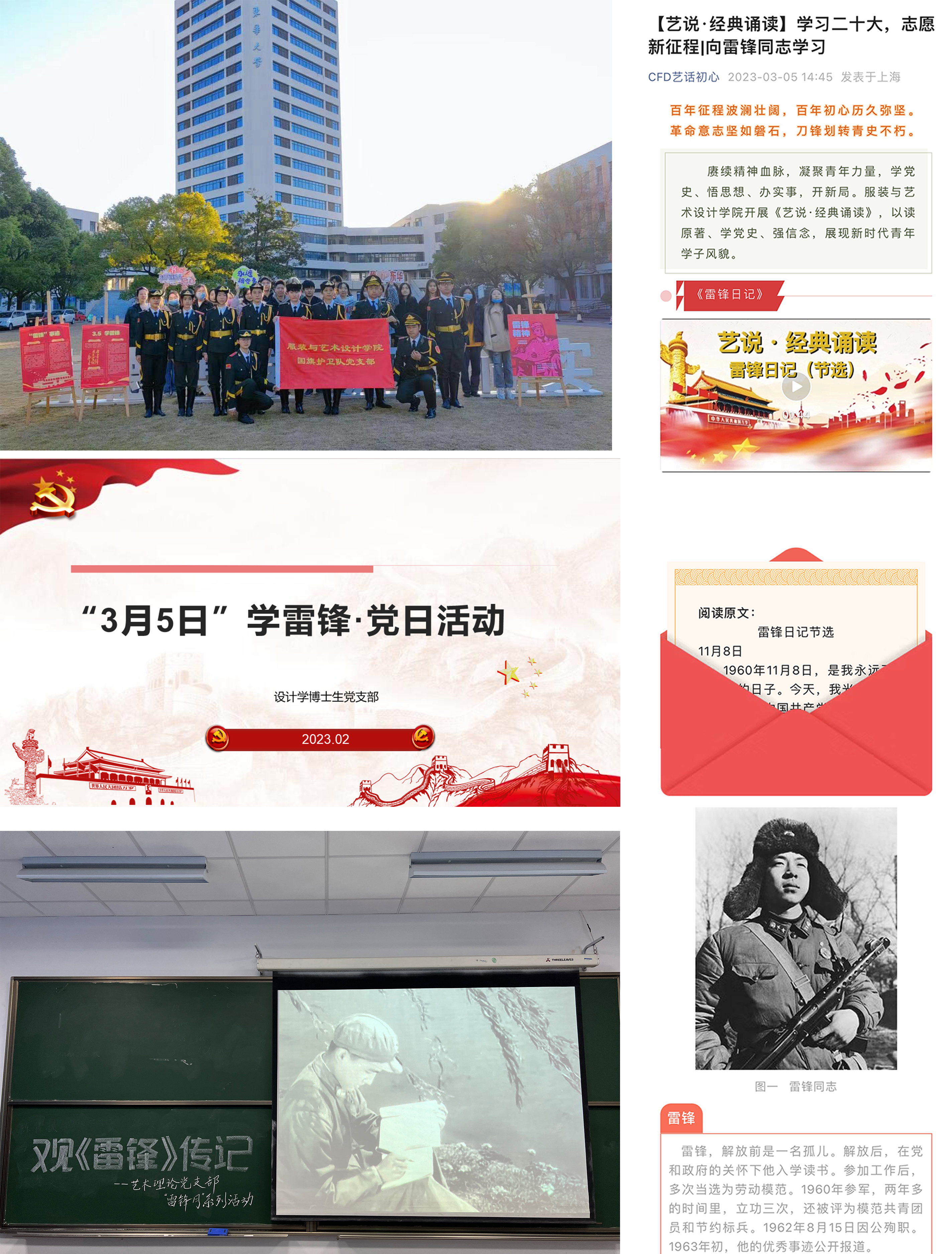 雷鋒精神歷久彌新,青年初心矢志不渝!今年是學習貫徹黨的二十大精神開局之年,是全面建設社會主義現代化國家新征程起步之年,雷鋒精神在新的時代背景下煥發出新的生機與活力。為弘揚雷鋒精神,服裝與藝術設計學院各學生黨支部在第60個“學雷鋒紀念日”到來之際,學習習近平總書記對深入開展學雷鋒活動作出的重要指示精神,深刻把握雷鋒精神的時代內涵與實踐要求,積極營造學習雷鋒精神的良好氛圍,開展了系列學雷鋒活動,將雷鋒精神世世代代傳遞下去。