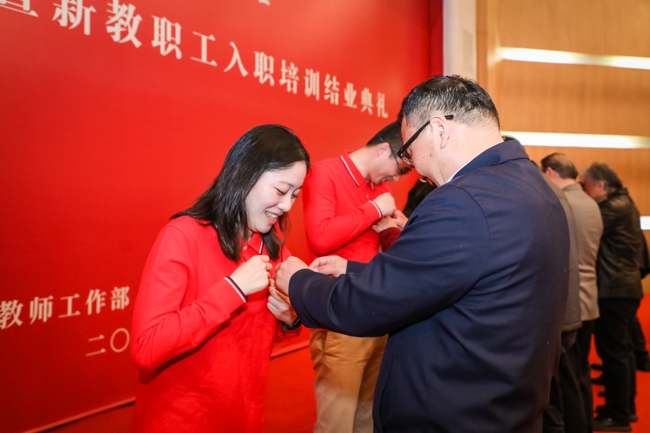 活動中,榮休教師為新教職工佩戴校徽,新教職工為榮休教師獻戴紅圍巾,在莊重、溫馨的“薪火相承”儀式中傳遞禮敬教師、賡續傳承的深刻寓意。