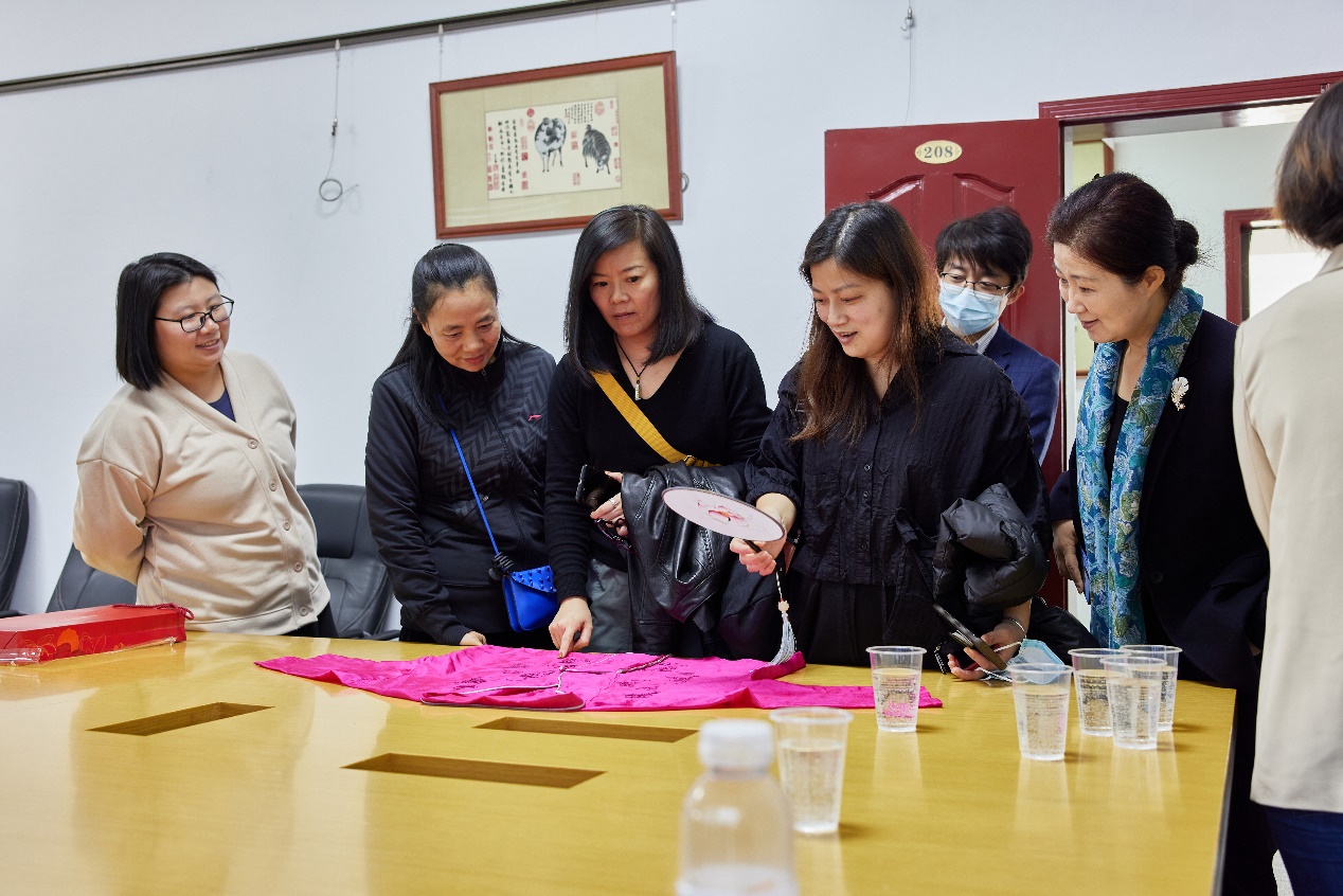 其后,回訪小組與恒源祥集團(tuán)黨委書記顧紅蕾等進(jìn)行了座談。顧書記向老師們介紹,恒源祥集團(tuán)目前有上海絨繡和海派絨線編結(jié)技藝兩個(gè)非遺工作室,工作室除了完成日常訂單制作外,還致力于非遺教育與傳承事業(yè),多次與學(xué)校合作開展項(xiàng)目:建黨百年時(shí),恒源祥與各中小學(xué)、高校合作,開展共繡黨旗活動(dòng),提供繡制工具、絨繡培訓(xùn),繡制了百面黨旗;今年三月,恒源祥集團(tuán)聯(lián)合全國雷鋒學(xué)校大聯(lián)盟的師生編織“雷鋒花”,獻(xiàn)給中共一大紀(jì)念館收藏以及裝點(diǎn)雷鋒紀(jì)念館的花籃,致敬雷鋒精神。柯玲表示,這些特色活動(dòng)將非遺傳承與學(xué)校德育相連接,展現(xiàn)了非遺教育傳承中企業(yè)寶貴的文化擔(dān)當(dāng)精神,同時(shí)感謝在自己主持的上海絨繡相關(guān)課題研究中恒源祥所給予的支持和幫助,并贈(zèng)送了課題研究又一學(xué)術(shù)成果《上海絨繡研究》(藝術(shù)人像)分冊(cè)。張順愛老師驚喜地發(fā)現(xiàn),恒源祥的非遺傳承實(shí)踐案例是很好的課程思政素材。