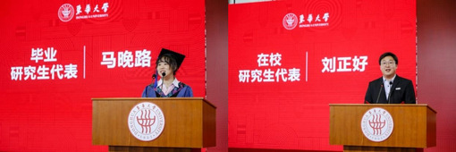 (畢業研究生代表馬晚路(左)、在校研究生代表劉正好發言)