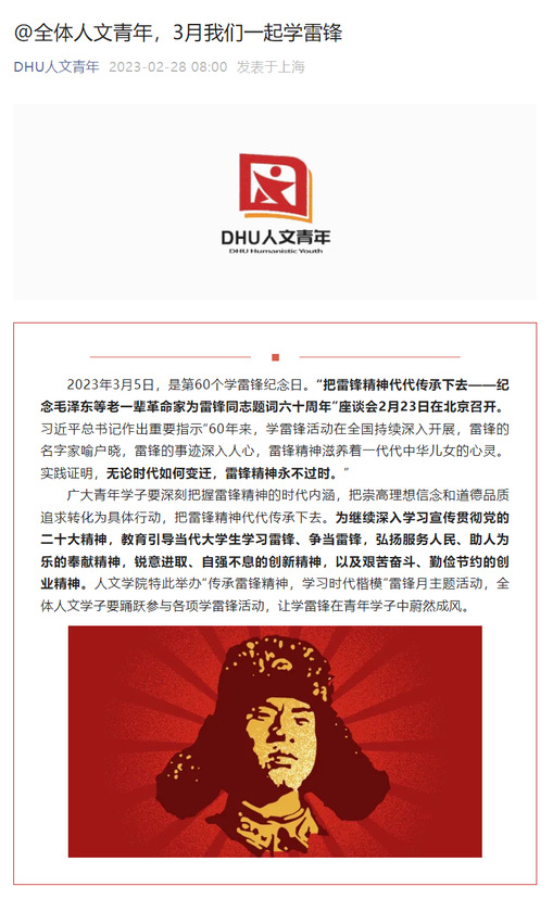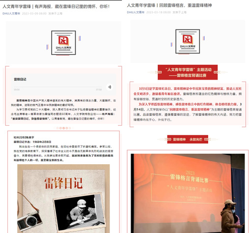 為學習貫徹習近平總書記對深入開展學雷鋒活動作出的重要指示精神,人文學院組織學院各黨員組織、青年學子深入開展“傳承雷鋒精神,學習時代楷?!崩卒h月主題學習實踐活動,引導學生通過主題黨日、團日和特色志愿活動,深刻學習領會雷鋒精神的時代內(nèi)涵和實踐要求,整合資源發(fā)布各類志愿服務活動信息,鼓勵全體人文學子踴躍參與各項學雷鋒活動,深入社區(qū)、場館等,以志愿服務實際行動書寫新時代雷鋒故事,全力推動“學雷鋒”在青年大學生中蔚然成風。